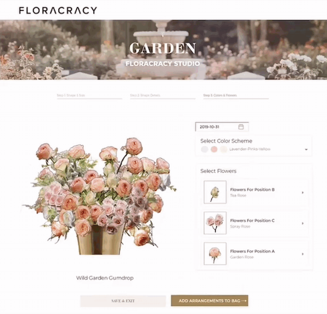 Floracracy's floral arrangement designer (Story Studio) is a tool that guides users to creating their own custom arrangements focusing on style, color, shape, size and flower type.