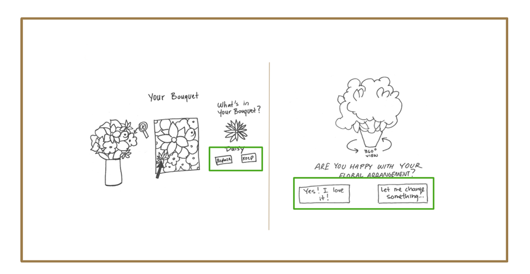 In concept 1, users really gravitated to the ability to go back and edit their arrangement, confirming that they’re happy with the end result of their floral design. Reassuring the customer that they have the ability to change their minds with no difficulty.