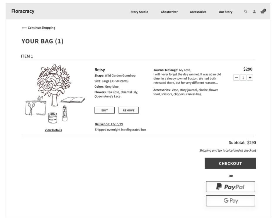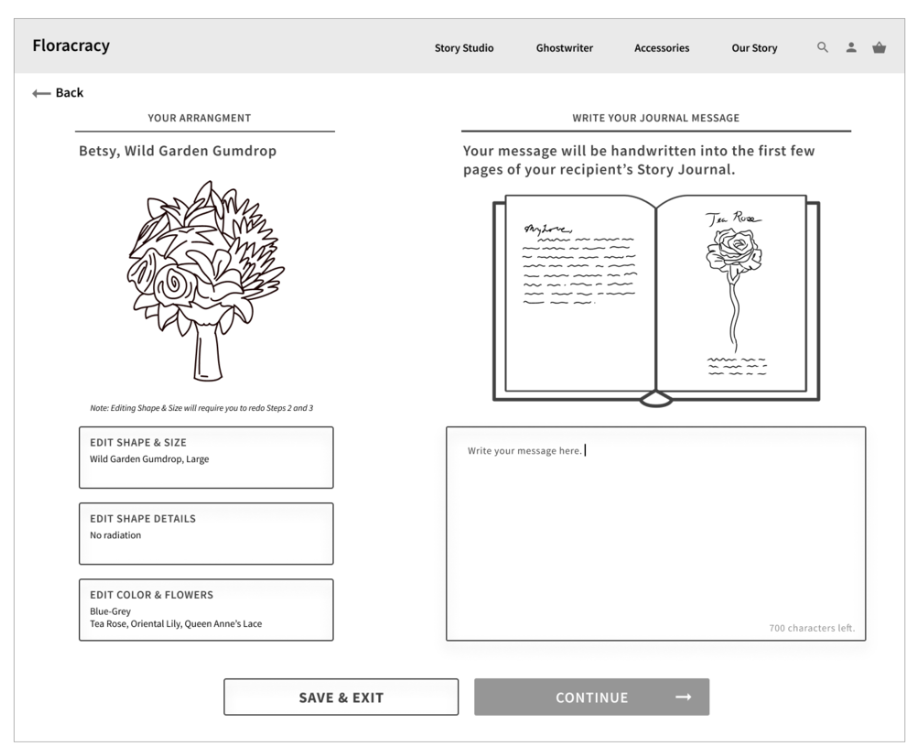 Here users are able to both edit aspects of their arrangement and enter the message in their story journal. On the left here you can see that they can easily edit each discrete step of the story studio process, while on the right they are given a simple but prominent way to type out of their message, while being provided with a preview of what the journal will look like. We decided to combine these two ideas on one page because we wanted to limit the number of steps users had to take before entering the checkout.