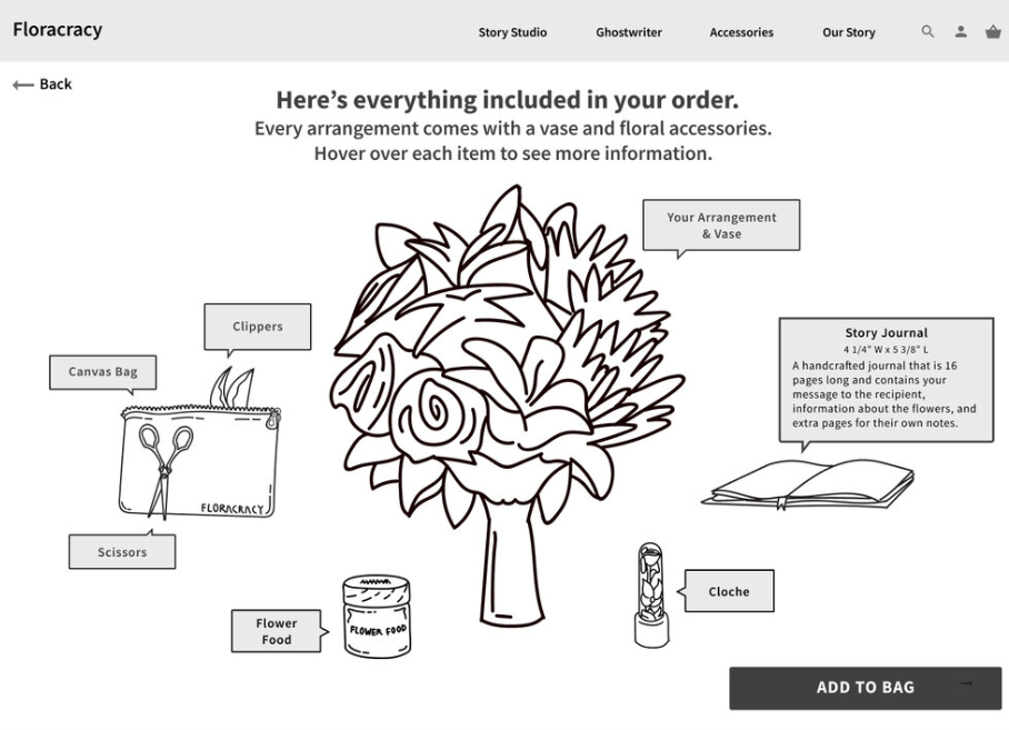 For the second concept, referencing our design principles, we wanted to confirm that buyer expectations are met before they get to the checkout page. After completing their floral design in the visualizer tool, users will be given a presentation of all of the items included in their purchase order before check out.