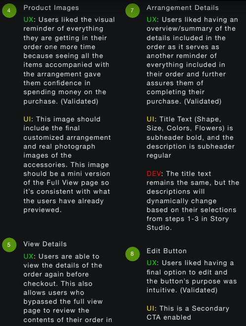 Testing revealed that usability issues throughout Story Studio (Arrangement builder) flow wasn’t the reason for lack of conversions, instead it was in the checkout flow. When entering the checkout, the users should feel the most confident and excitement about their purchase, when the opposite was happening. Users felt they were most uninformed on this page, where they didn’t quite understand the value of their purchase. Leaving the users with a lack of confidence and uncertainty around the arrangement they’ve just made.