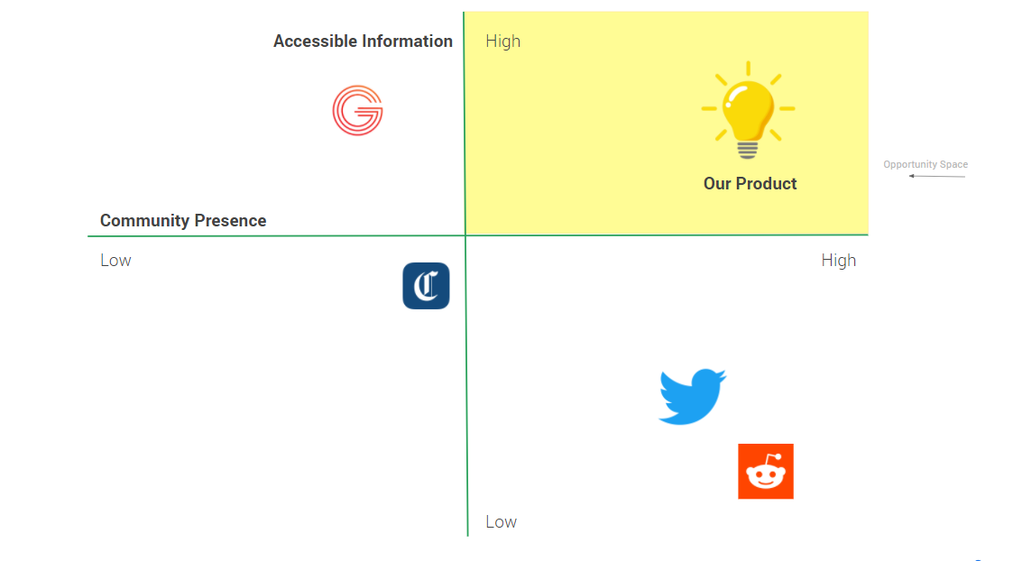 Our key takeaway shows us that no competitor offers both policy information and social collaboration.