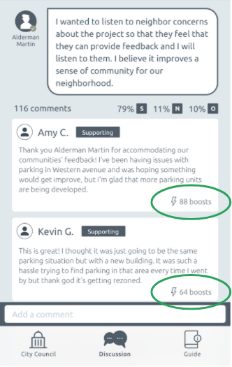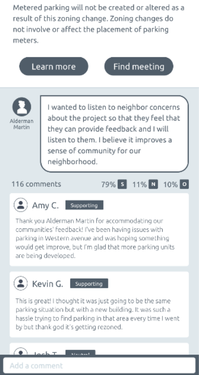 After testing, our team improved interaction on the page by adding a feature to like or "boost" a comment, so users seeing the page can see which comments have the most value to the discussion. Our team also incorporated a way to control unfriendly comments by allowing users to report anything that does not meet community guidelines.